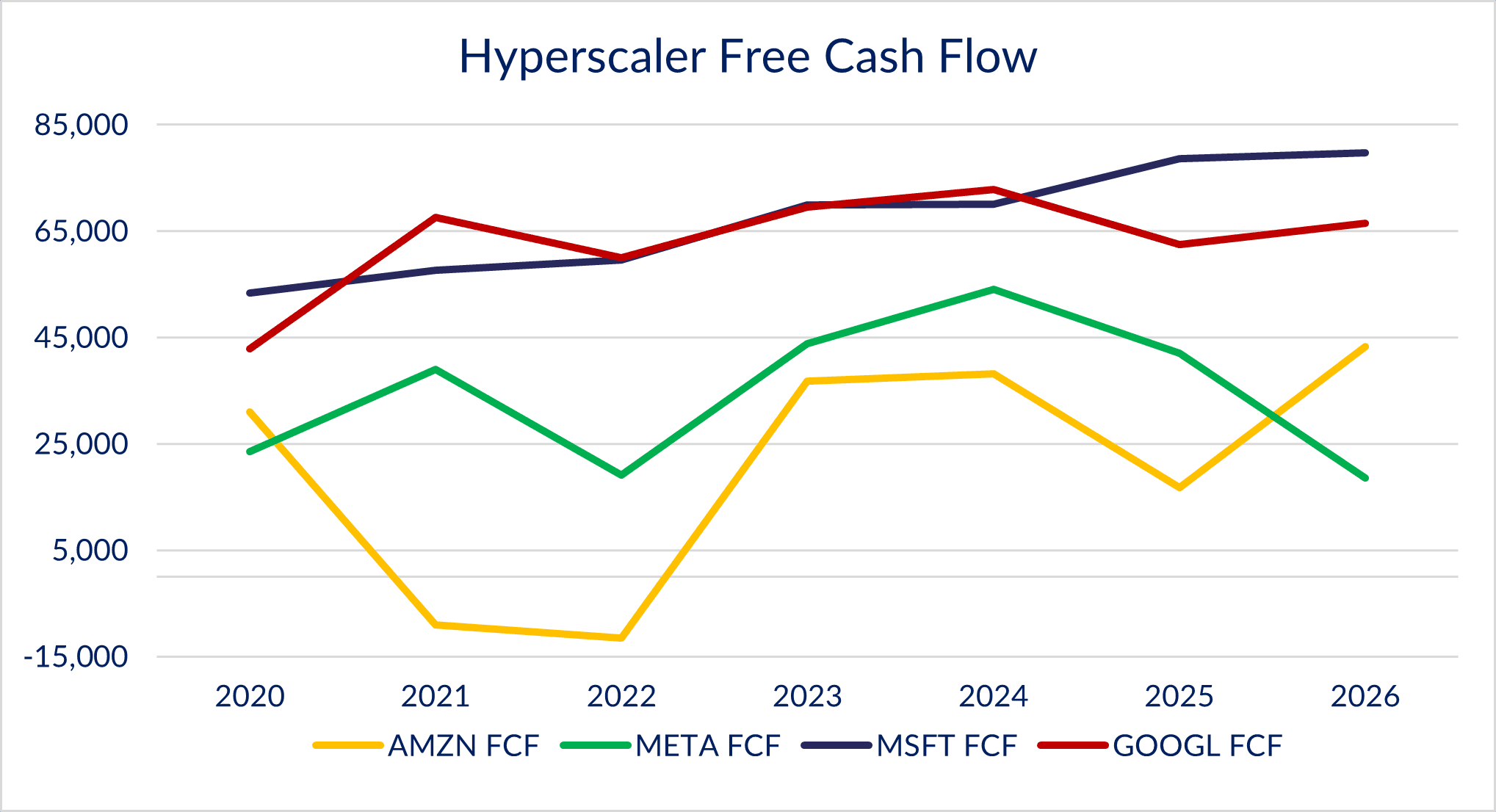 The scale of this commitment sent the shares down more than 11% post report, with many questioning the end goal of the AI spend and likening it to Mark Zuckerberg’s 2022 pursuit of the ‘metaverse’. This concern is not without merit, as the weight of spending is now starting to eat into the free cash flow numbers shown on the chart below. Again, what stands out here is Meta’s falling numbers against an expected increase for the other names during FY26.