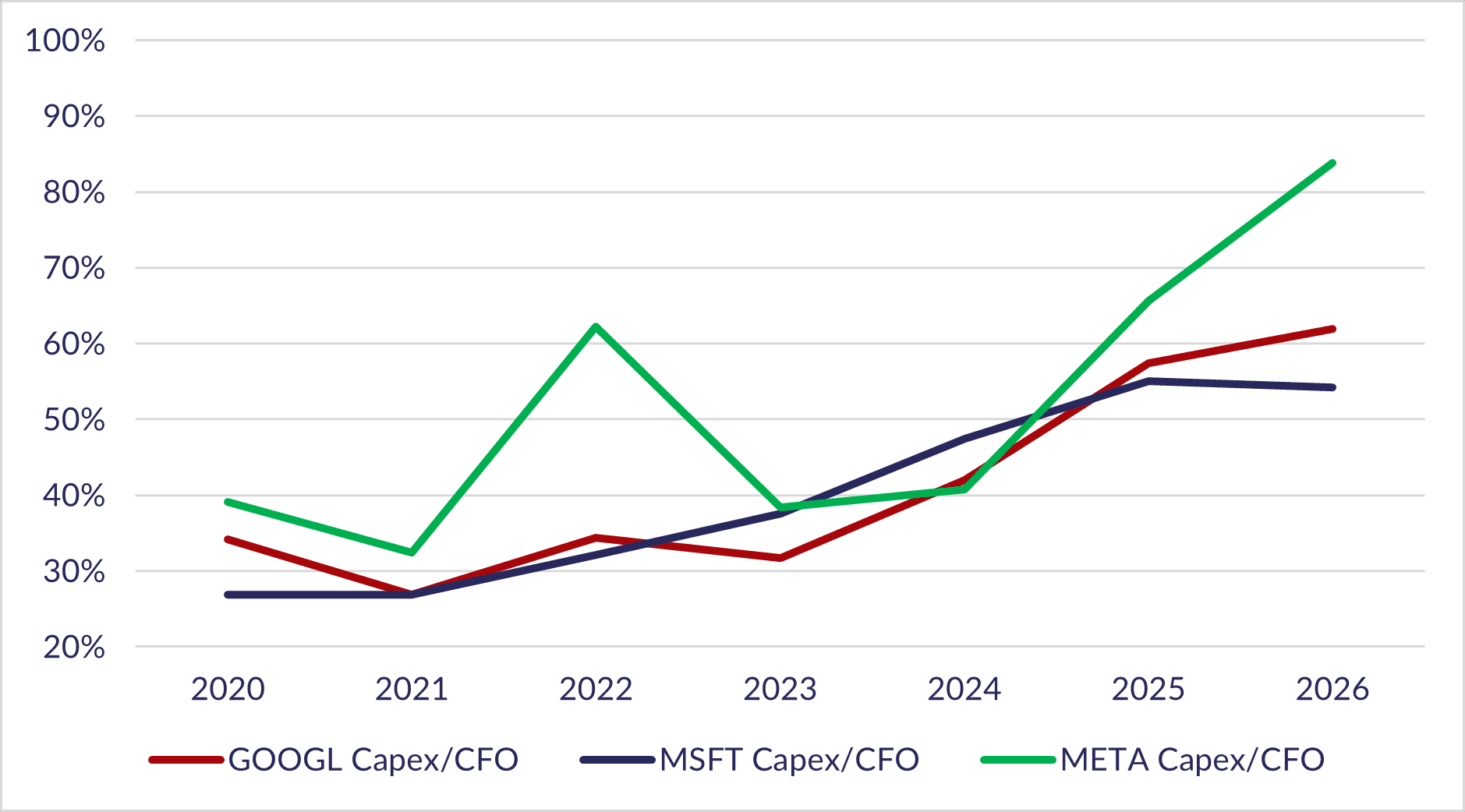The numbers themselves certainly support this thesis, with Meta, Microsoft, Alphabet and Amazon expected to spend north of $480bn in capex during FY26, a number which many expect to ramp further as we close out the year. This is obviously a huge absolute figure, but a closer look at how it’s funded by operating cash flows provides a fresh perspective. The below chart illustrates this by showing each company’s estimated capex divided by their cash flow from operations, showcasing the increasing capital intensity over the past 3 years. What really stands out though is the significant jump from Meta, whose capital intensity is expected to more than double from ~40% to over 80% in FY26.