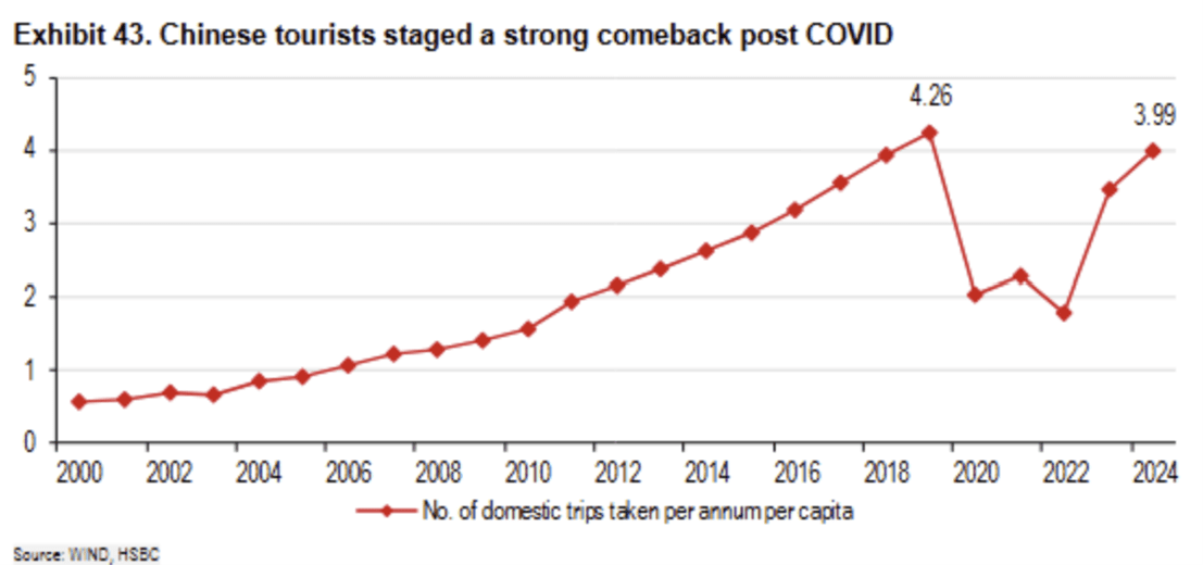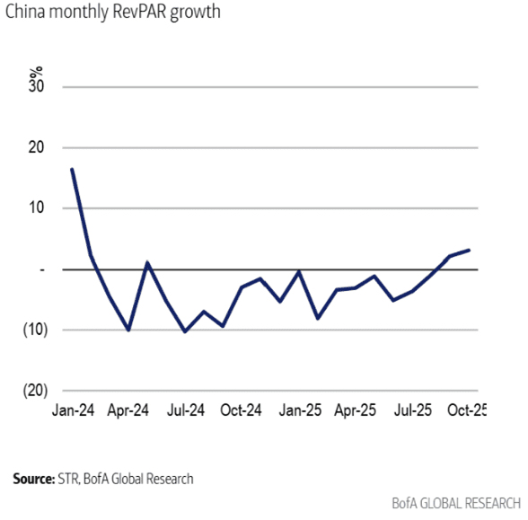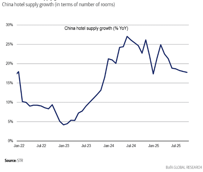 El turismo chino ha experimentado una tendencia de crecimiento estructural durante la mayor parte de las dos últimas décadas. Las restricciones por la COVID redujeron el nivel de viajes durante varios años, pero la demanda repuntó rápidamente una vez que se levantaron. Aunque esto fue positivo para la demanda, también vino acompañado de una aceleración significativa en la oferta hotelera, lo que ha generado una dinámica de precios negativa en los últimos años. El aumento de la oferta fue una respuesta a las buenas perspectivas a largo plazo para la demanda de viajes, combinadas con un mercado bursátil deprimido y un mercado de vivienda residencial estancado, que obligaron a los inversores a buscar alternativas.