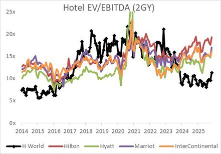La mejora en los precios hoteleros en China ha impulsado el precio de la acción de H World y, sin embargo, los múltiplos de valoración siguen siendo bajos en comparación con su histórico y también frente a sus pares hoteleros en Estados Unidos, lo que sugiere que aún existe un significativo potencial de revalorización.