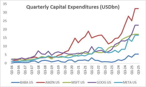 Alibaba is well known as a leading ecommerce player in China but is quickly becoming a global leader in cloud and AI with revenue growth for Alibaba Cloud accelerating to 26% YoY in Q2 2025 and the company’s Qwen AI model consistently ranked amongst the top large language models internationally. What is more remarkable is that the company has achieved this success with much lower capital expenditures than its US peers and, whilst the US hyperscalers struggle to access the power required for their growing datacentre pipeline, China has no such issues, leaving a clearer runway for growth. All of this comes at a much lower valuation than US peers, relative to growth, making this a good investment in our view.