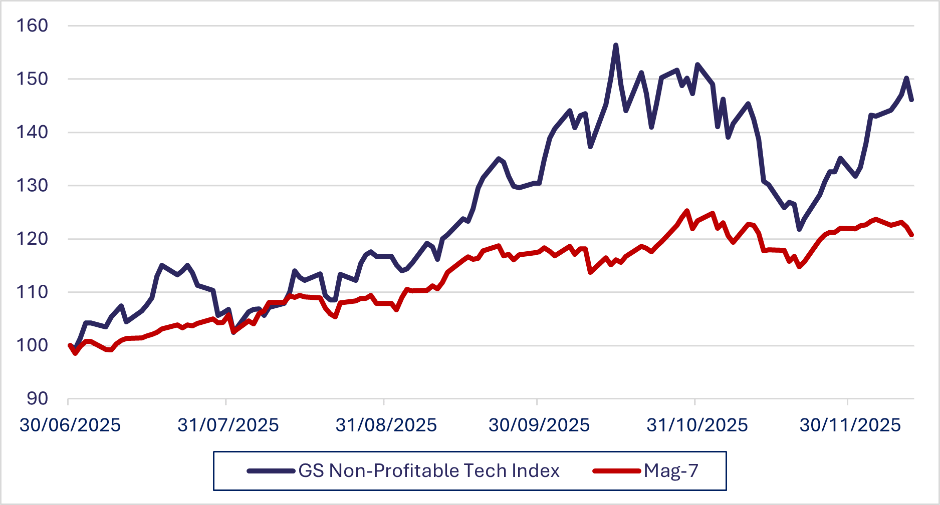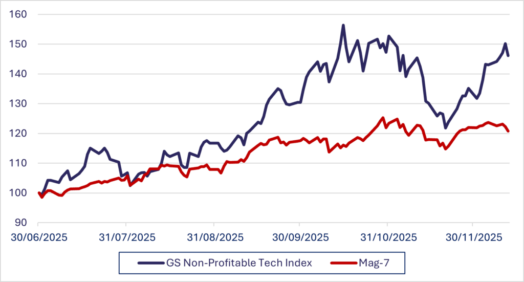 Digging deeper, the key themes that drove second half market performance were a sharp comeback for the ‘Magnificent 7’ (Mag-7) and what we view as a low-quality rally in tech. The chart below illustrates how meaningful these moves have been since the start of July, with the Mag-7 Index up over 20% and the Goldman Sachs Non-Profitable Tech Index up a staggering 46%. Many companies within the index do not meet Aubrey’s investment criteria of 15% ROE, 15% EPS growth and 15% CROA.