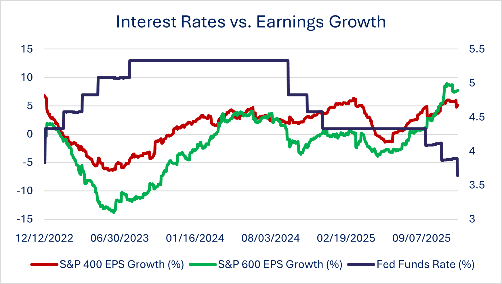 Additionally, the Fed’s rate-cutting cycle should benefit smaller businesses with more leverage, and ease pressure in the housing market as mortgage rates follow. The latter is of particular importance given that shelter accounted for 36% of the annual rise in CPI in September. For all the fanfare about tariffs and their inflationary impacts, shelter and other services remain a far more important factor than goods. As a result, we expect inflation to remain elevated but under control, which should support further rate cuts during 2026.