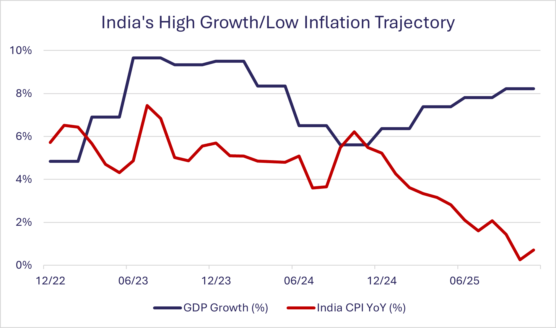 India remains the most compelling long-term investment opportunity in EM, with strong economic growth and subdued inflation setting the scene for 2026. India underperformed during 2025, likely serving as a source of funds for cheaper markets elsewhere, as well as the technology tailwinds previously mentioned in Korea and Taiwan. However, our conviction remains strong and GDP growth of over 8% in the second quarter serves to justify our thinking, while inflation remains comfortably under control. The Goods and Services Tax (GST) reforms implemented in September and the potential for further rate cuts by the Reserve Bank of India should also add further stimulus for the year ahead.