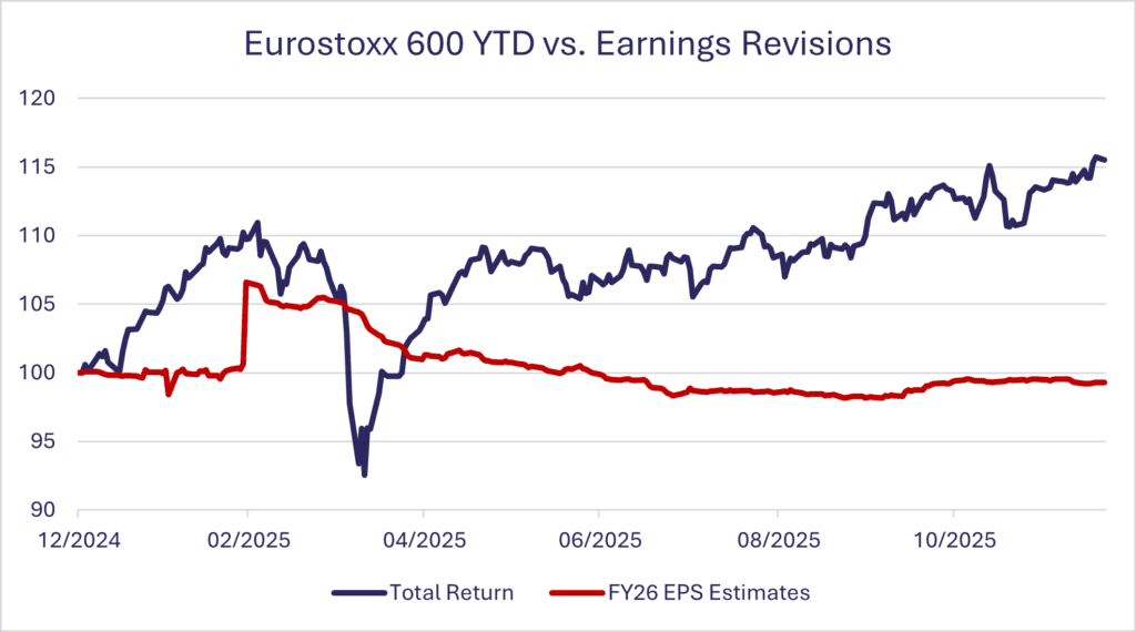 Europe has been a strong source of performance for the portfolio last year, led by Rheinmetall and Safran. It was a good year for Europe overall, with the Euro Stoxx 600 up over 21% in Euro terms, and Euro strength adding to returns. However, it feels as though Europe benefitted from a similar theme to China as an U.S. alternative at more reasonable valuations. The chart below illustrates this, with a steady uptrend for the index that hasn’t been matched by upward revisions to 2026 earnings numbers, meaning all the performance has been attributed to multiple expansion.