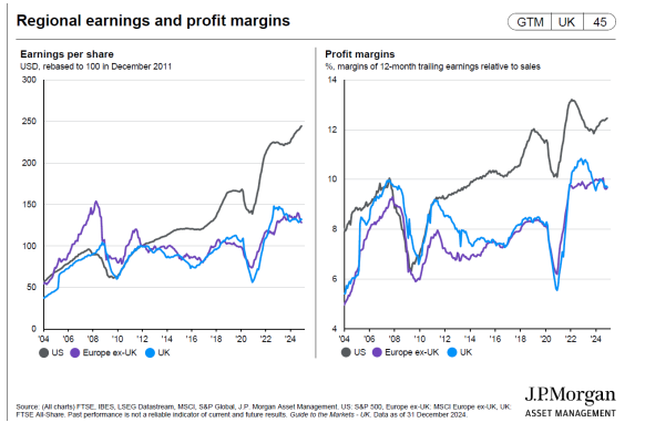 As can be seen from the following charts, earnings per share in the US and profit margins have remained strong and growing. The structural advantages of the US remain: their technological advantages, lower levels of regulation (and further deregulation has been promised by Trump) and the security and economy of energy supply. Cheaper oil and gas puts the US at an advantage – the US was already producing a record amount during the Biden administration.